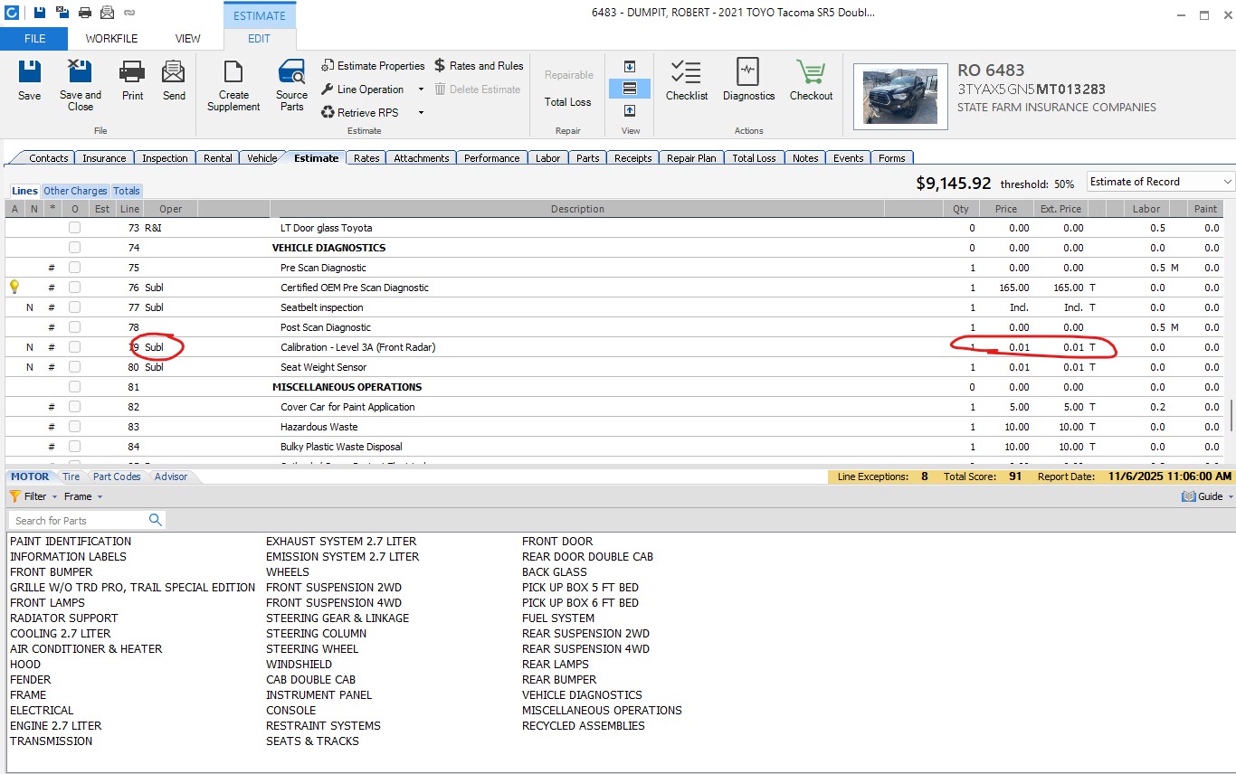 There are a few things to check going forward. First, since the item isn’t in the Parts tab, we go to the Estimate tab and see if it’s there. If it is listed on the Estimate tab, we need to make sure that it is listed as a sublet and has a price.